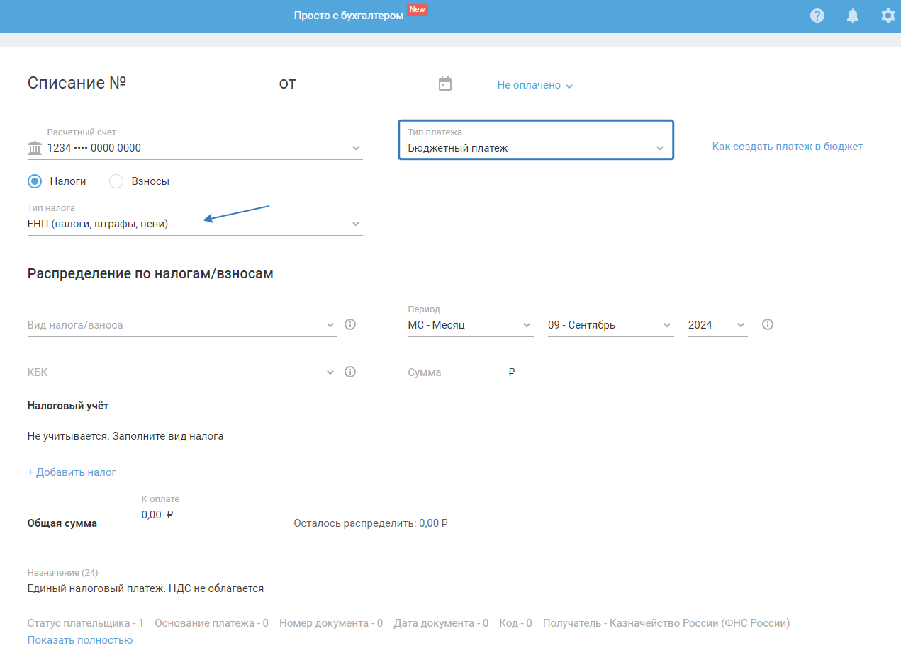 Во вкладке «Деньги» вы можете самостоятельно создать платёж по ЕНП. Для этого выберите тип списания «Бюджетный платёж»:
