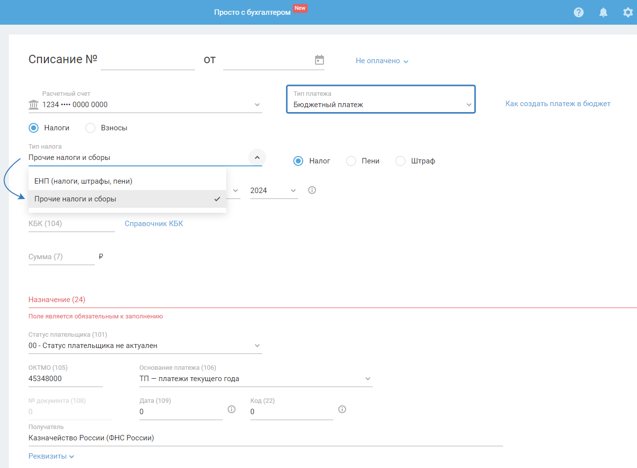 Помимо ЕНП в налогах вы найдёте «Прочие налоги и сборы». Тип «Прочие налоги и сборы» применяется при уплате пошлин.