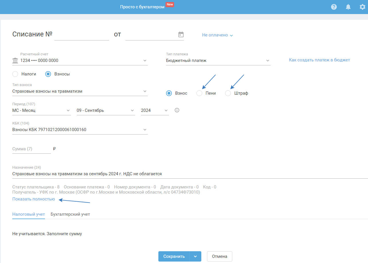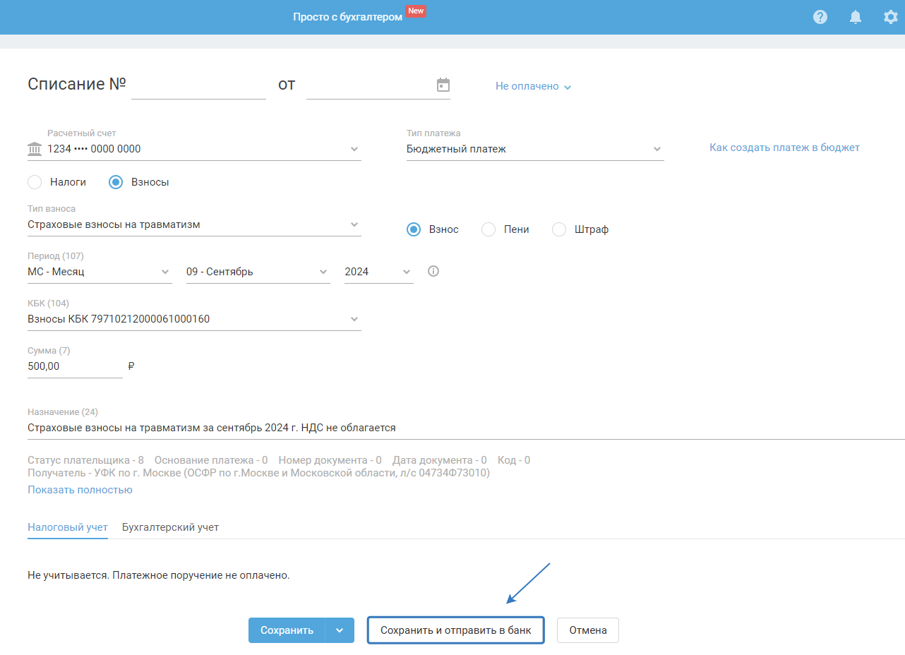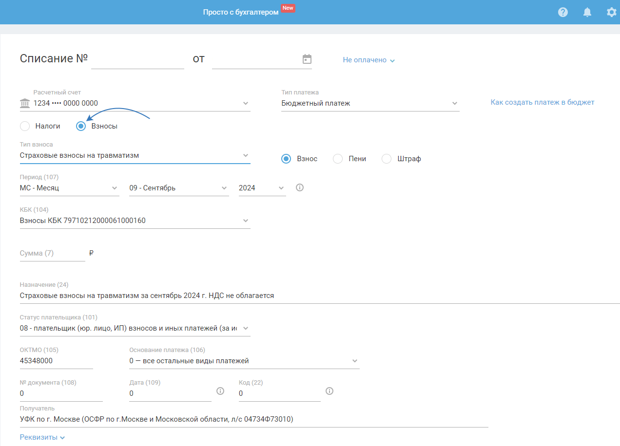 В типе «Взносы» вы можете создать платёжное поручение на перечисление «Страховых взносов на травматизм». Все реквизиты подставятся автоматически, вам останется внести только сумму: