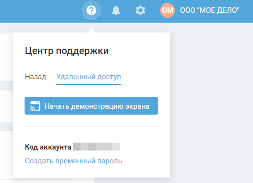 В подразделе «Удалённый доступ» вы можете настроить общий доступ к экрану вашего устройства для сотрудников компании «Моё дело». Например, эта функция может пригодиться, если вы только начинаете свое знакомство с функционалом интернет-бухгалтерии. Также здесь вы можете сгенерировать временный пароль, если возникла необходимость подключения наших специалистов непосредственно к вашему аккаунту.