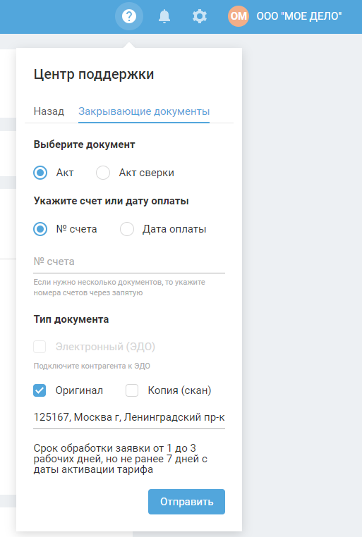 Срок обработки заявки на закрывающие документы составляет от 1-го до 3-х дней. Для того, чтобы наши специалисты смогли подготовить документы, необходимо, чтобы с даты начала действия тарифа прошло не менее 7 дней.