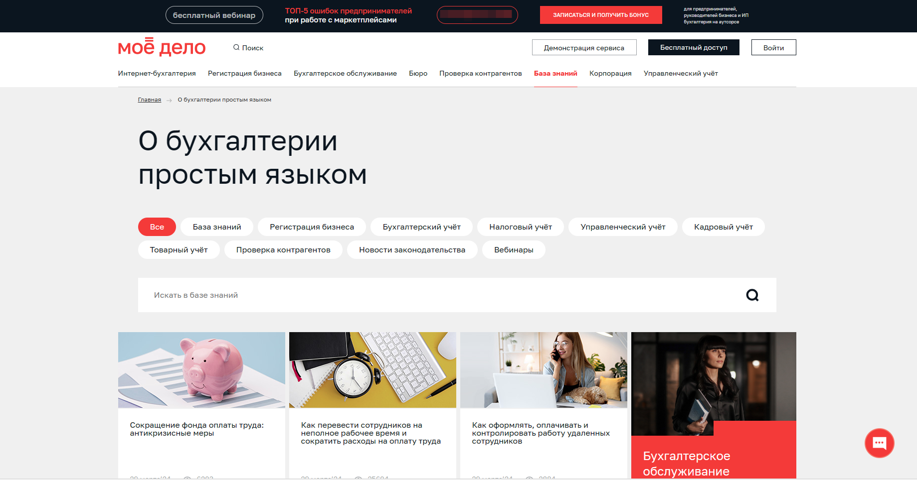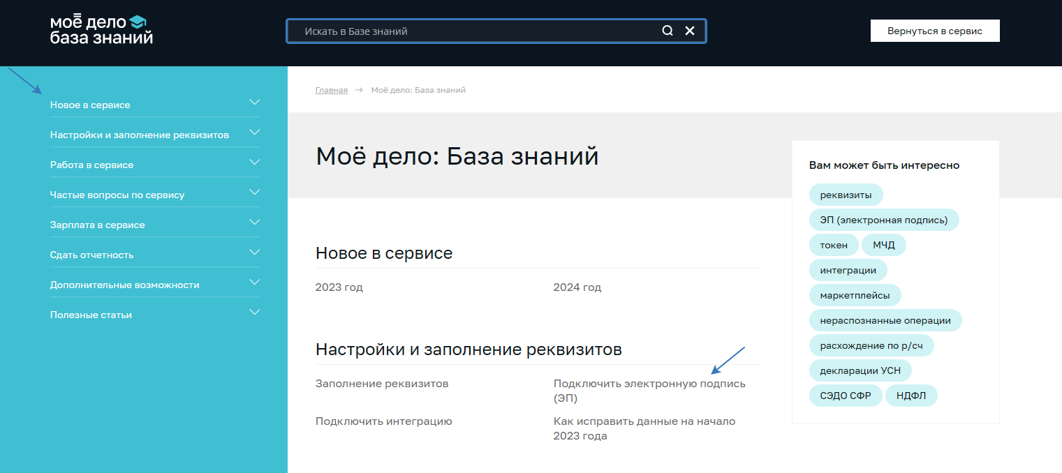 При необходимости воспользоваться одной из инструкций по работе в сервисе перейдите в подраздел «База знаний». После этого в соседней вкладке браузера откроется мануал — Моё дело: База знаний.