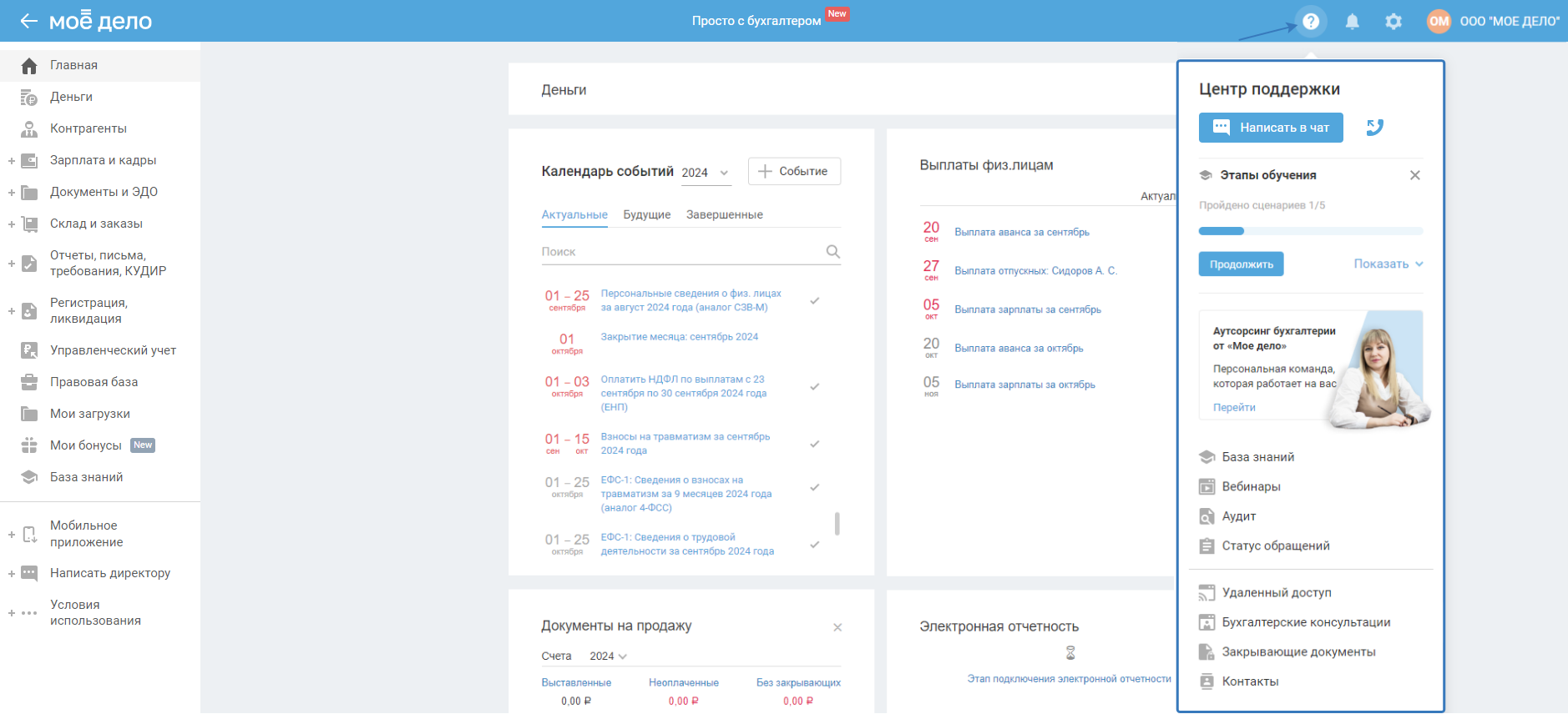 Центр поддержки — это раздел сервиса, который поможет получить помощь, если вы столкнулись с трудностями при работе в сервисе интернет-бухгалтерии. Для перехода в центр поддержки воспользуйтесь иконкой раздела на панели в верхней части страницы.