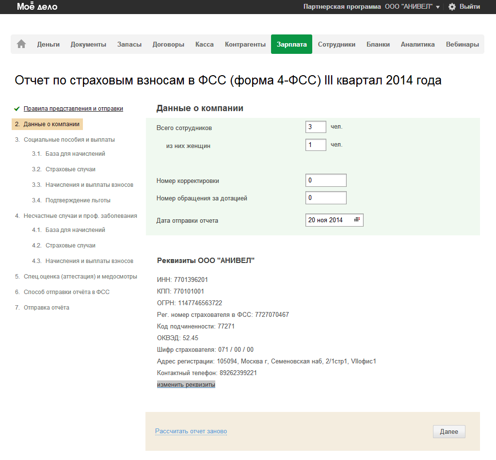 Проверьте данные о компании. При формировании уточненного отчета, заполните поле "Номер корректировки". (*Что это?)