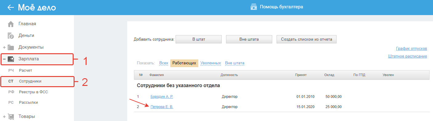 Для создания декретного отпуска перейдите в раздел «Зарплата» - «Сотрудники» и выберите сотрудника, кликнув на него мышью.