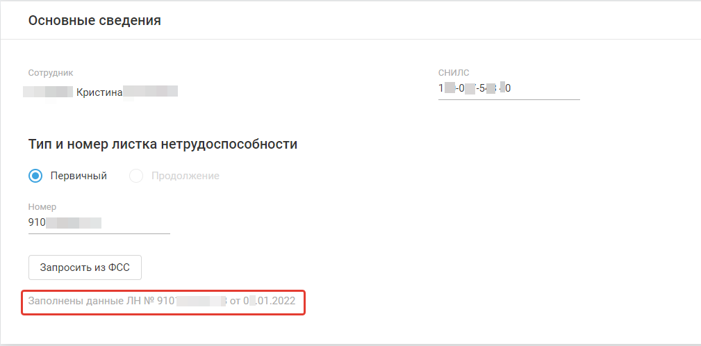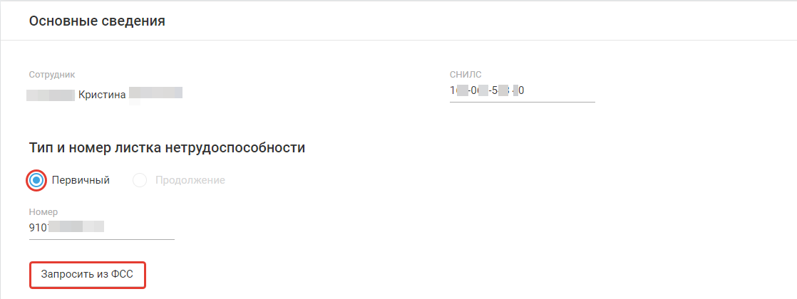 - Нажмите кнопку «Запросить из ФСС» для автоматического заполнения раздела «Данные листка нетрудоспособности».