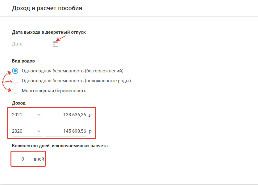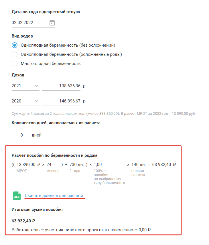 После внесения данных сервис автоматически рассчитает сумму пособия по беременности и родам.