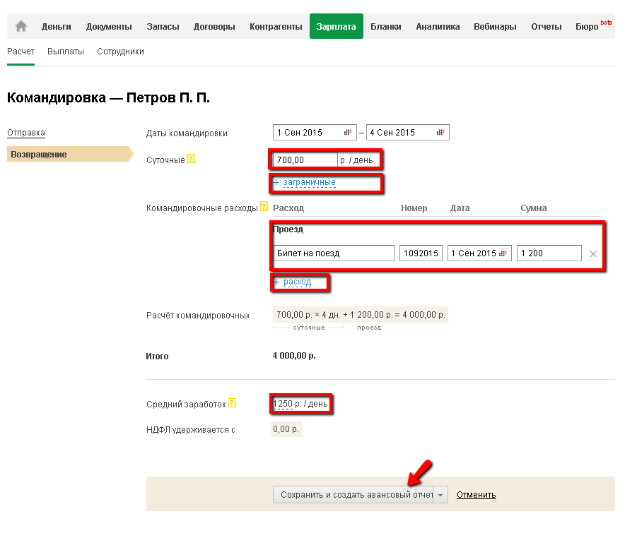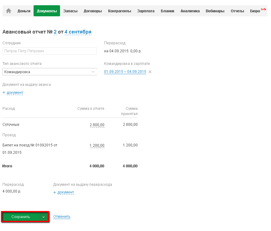 После нажатия на кнопку "сохранить и создать авансовый отчет" сервис автоматически откроет уже заполненную форму авансового отчета. Проверьте заполненные данные и нажмите "сохранить". Подробнее о командировках смотрите также здесь и здесь.