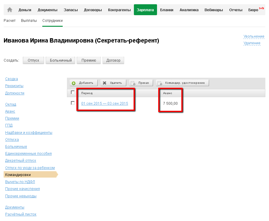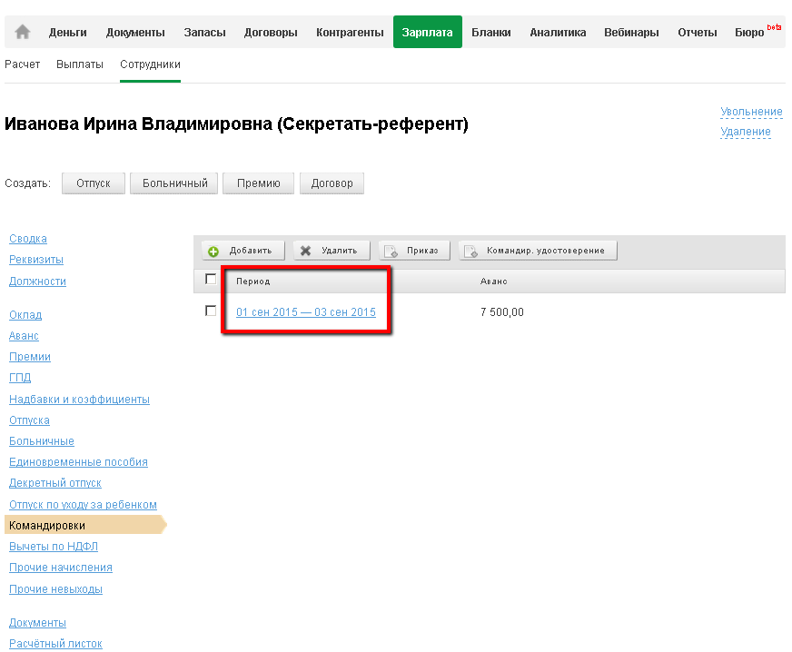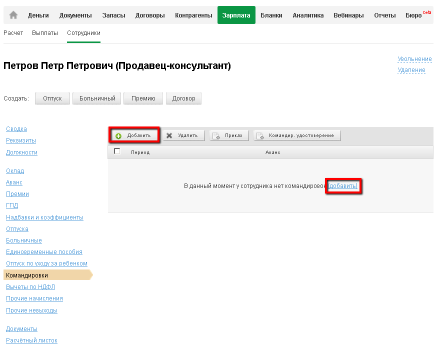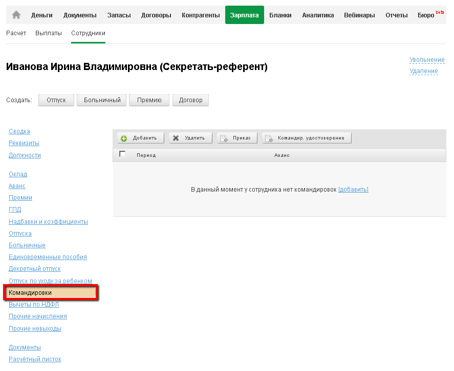 Этот раздел предназначен для добавления и редактирования информации о командировках работника. Для начала работы нужно перейти в пункт бокового меню - "командировки".