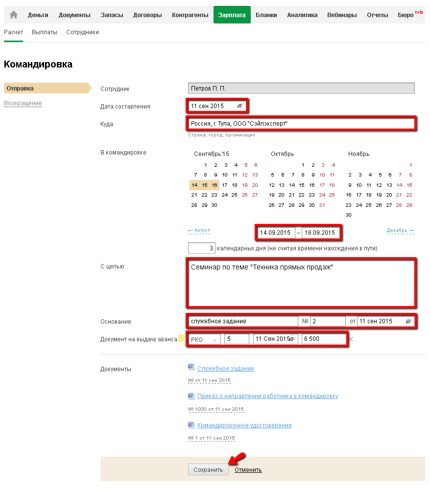 Служебное задание, командировочное удостоверение и приказ о направлении работника в командировку сервис сформирует автоматически. Ссылки на эти документы указаны внизу страницы. После заполнения всех граф нажмите "сохранить".