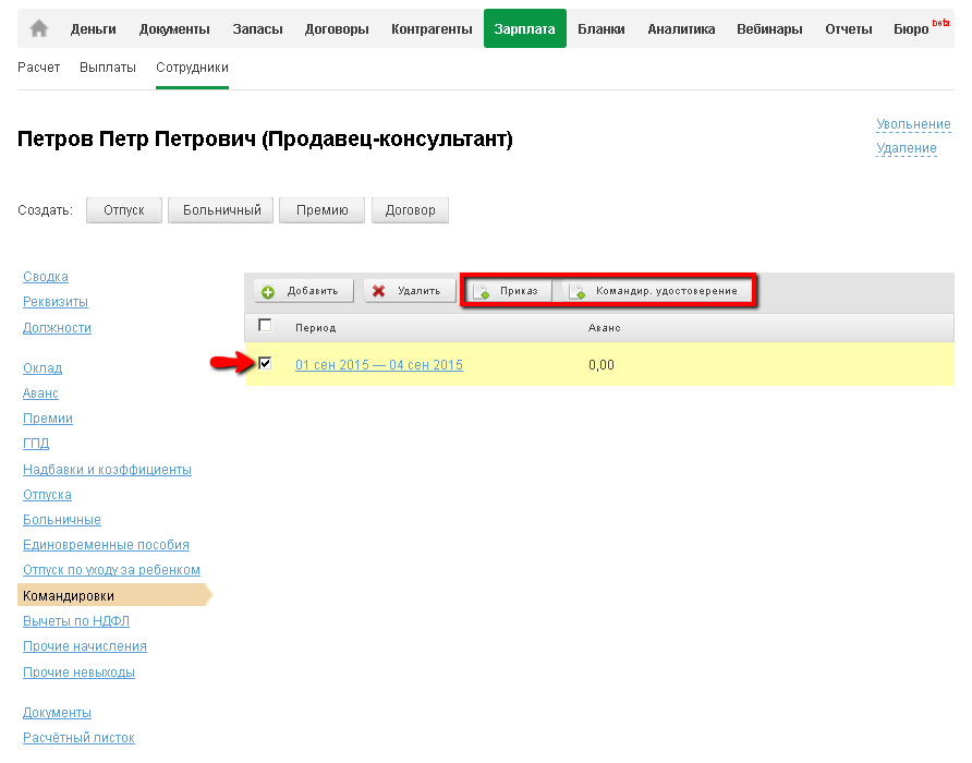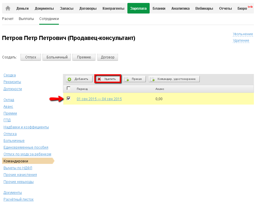 Чтобы удалить информацию о командировке (например, если она была добавлена по ошибке), напротив нужной строки нужно поставить галочку и нажать на кнопку "удалить".