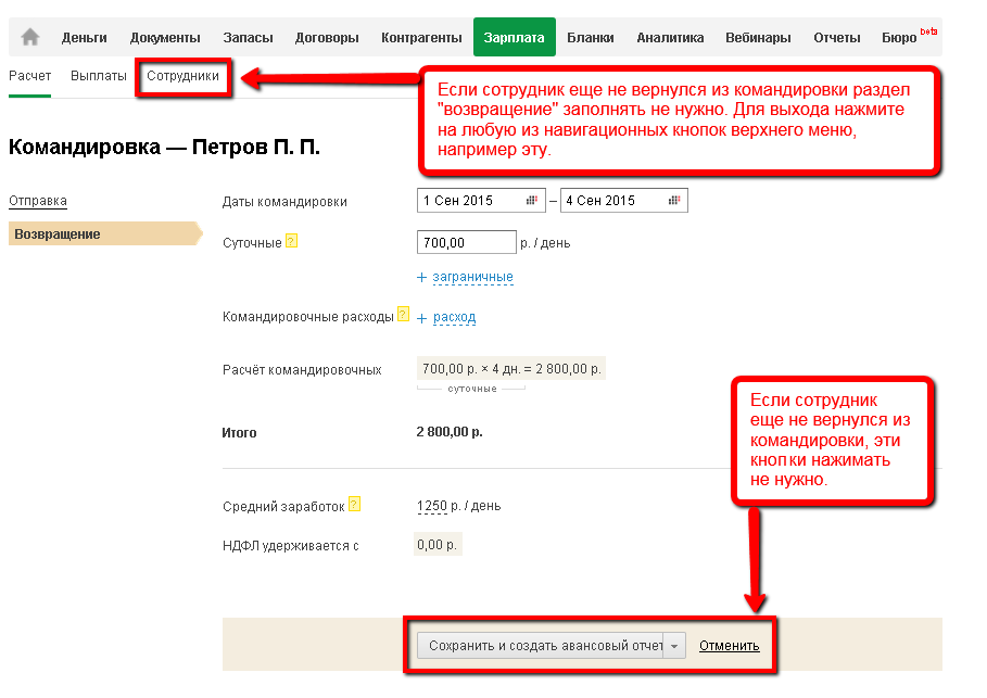 Важно! После нажатия на кнопку "сохранить" сервис автоматически перейдет в раздел "возвращение", поэтому если работник еще не вернулся из командировки, его заполнение можно пропустить. Для этого нажмите любую навигационную кнопку на верхнем меню (например, "Сотрудники"), кроме "сохранить и создать авансовый отчет" и "отменить" внизу страницы.
