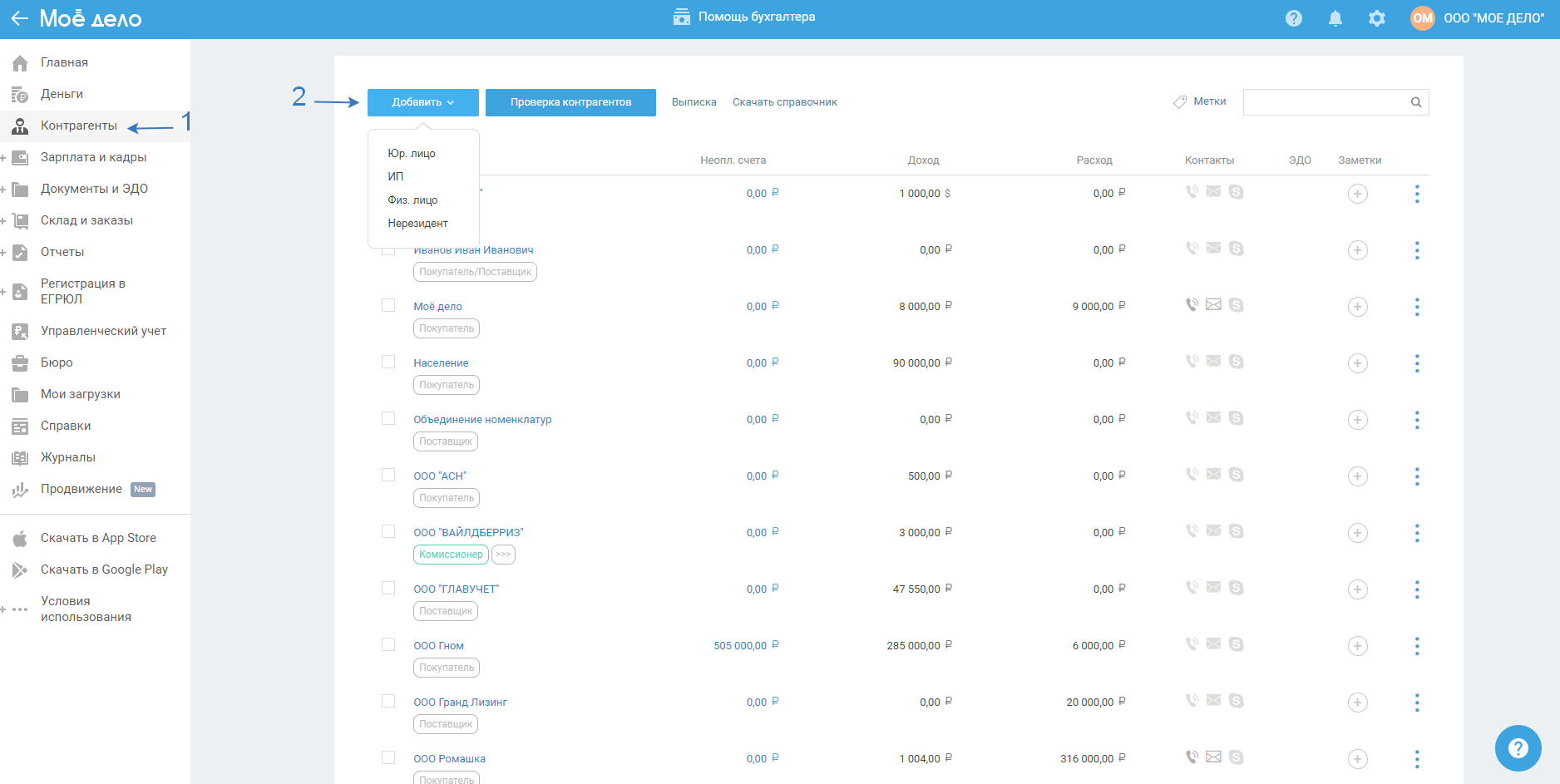 1. Подробную информацию о новом клиенте, партнере, поставщике и т. д. можно добавить в разделе «Контрагенты». Для этого выберите раздел «Контрагенты» на главной странице, нажмите на кнопку «Добавить», выбрав нужный тип контрагента: