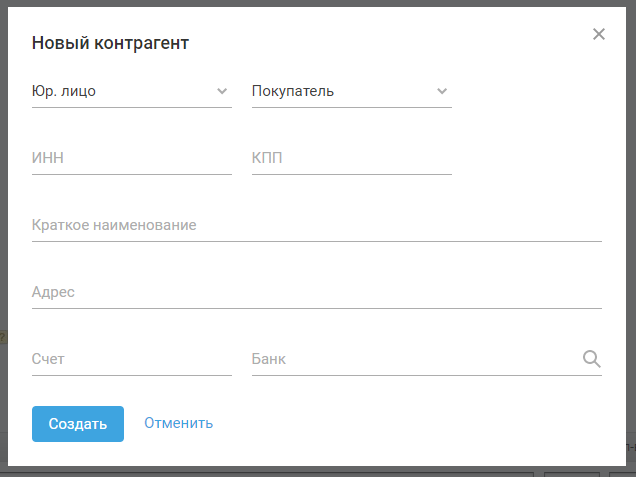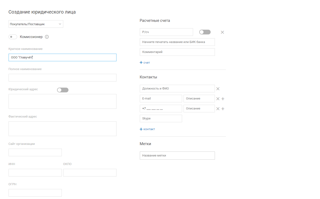 При ручном заполнении данных обязательным полем является только кратное наименование/ФИО контрагента, остальные поля заполняются на ваше усмотрение: