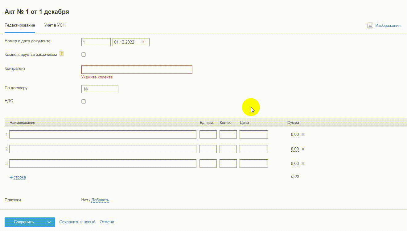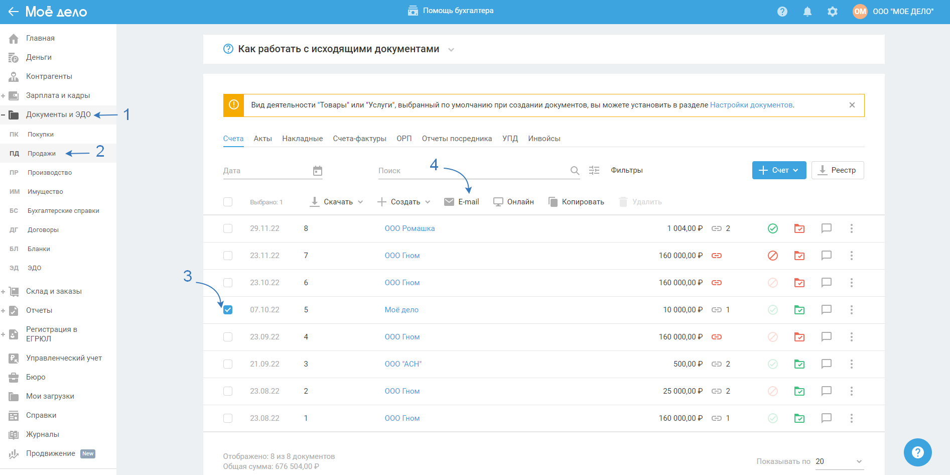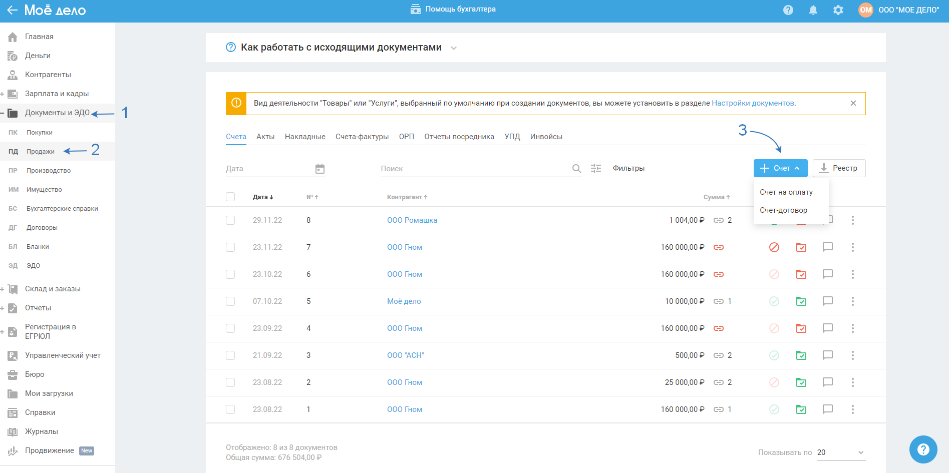 - В разделе «Продажи» при добавлении Счета, Акта, Накладной, Счет-фактуры или УПД.