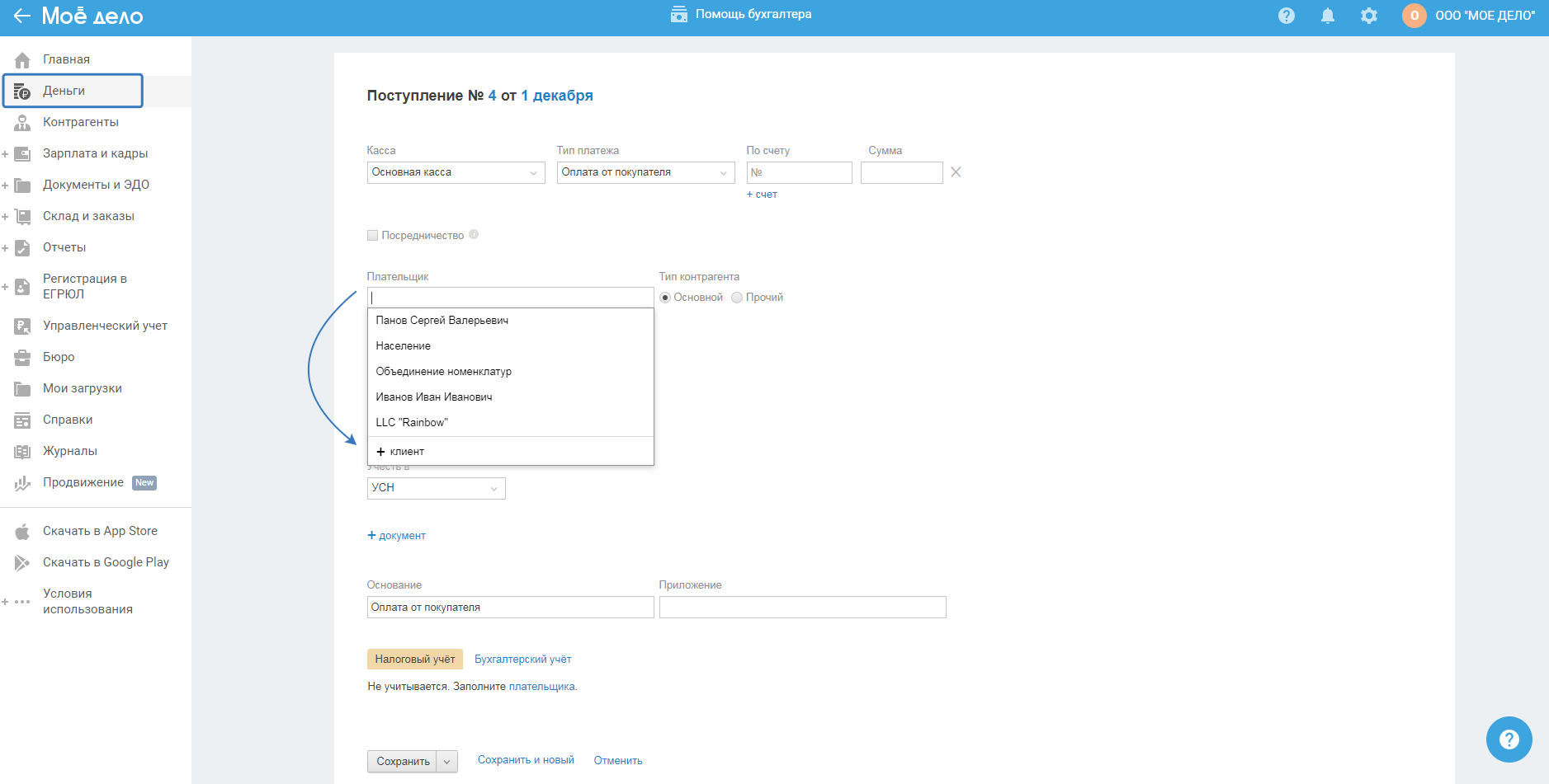 2. Нового контрагента можно добавить при заполнении раздела «Деньги»: в случае, если при создании нового Поступления или Списания необходимо указать контрагента, который ранее еще не был отражен в сервисе в разделе «Контрагенты».