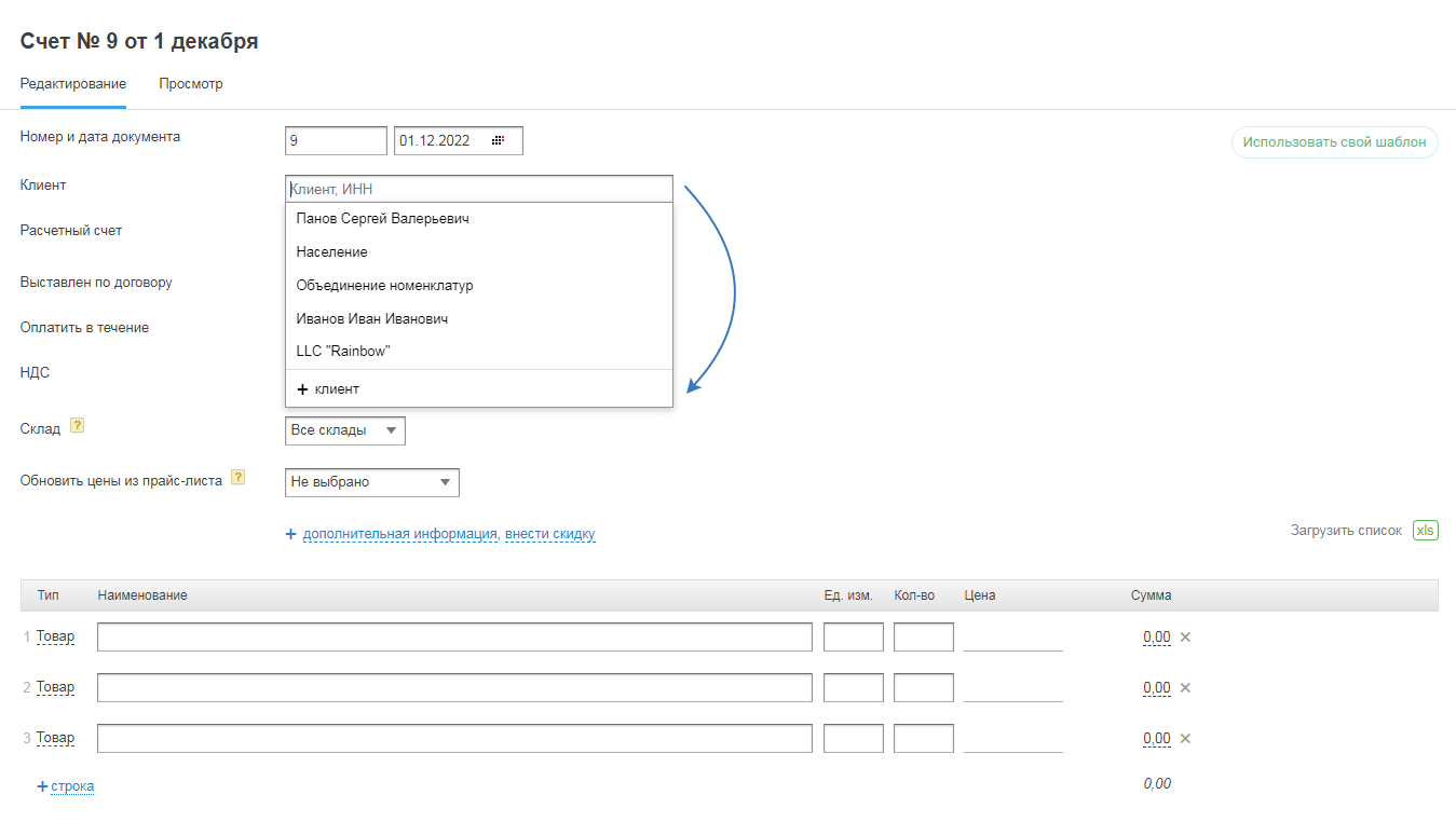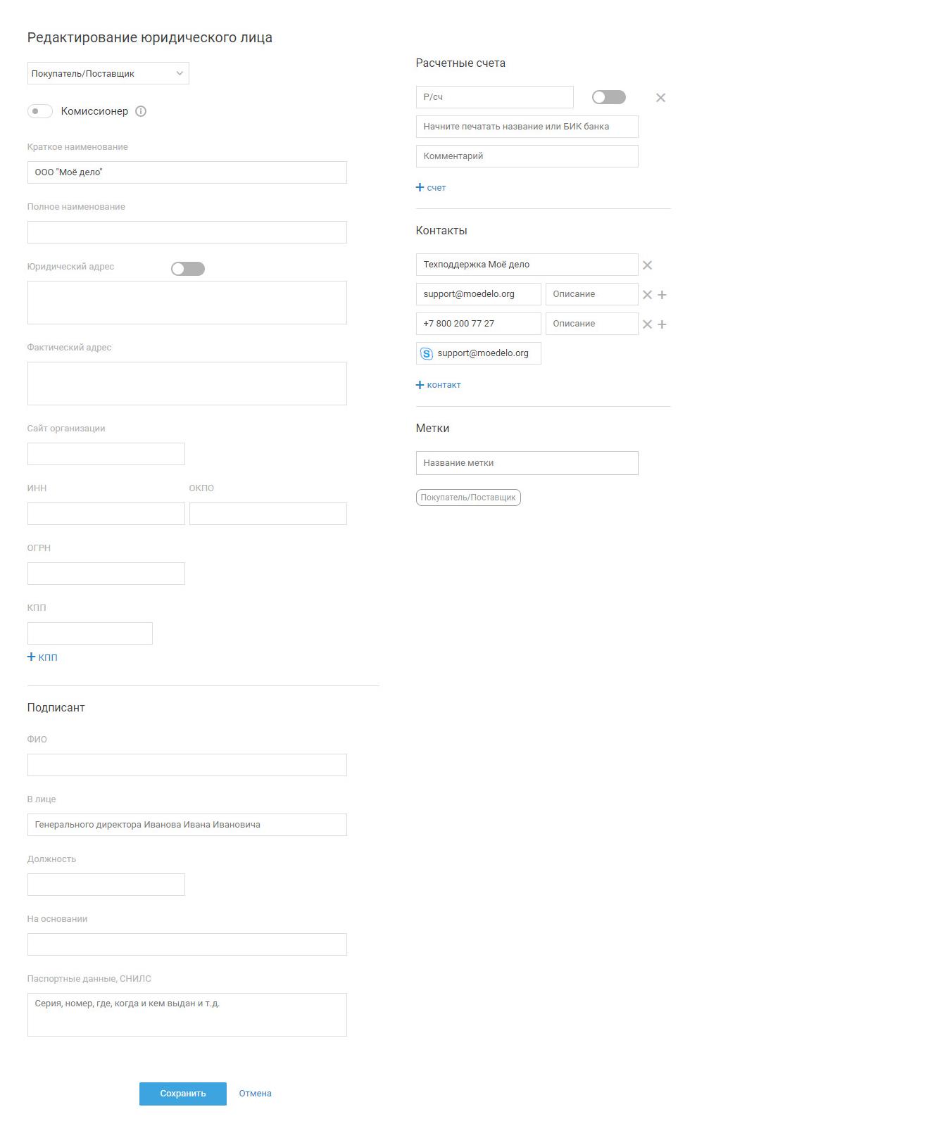 Юридическая информация о контрагенте затем будет отражаться в выставляемых вами счетах, актах/накладных, а также в формируемых в сервисе договорах и платежных поручениях: