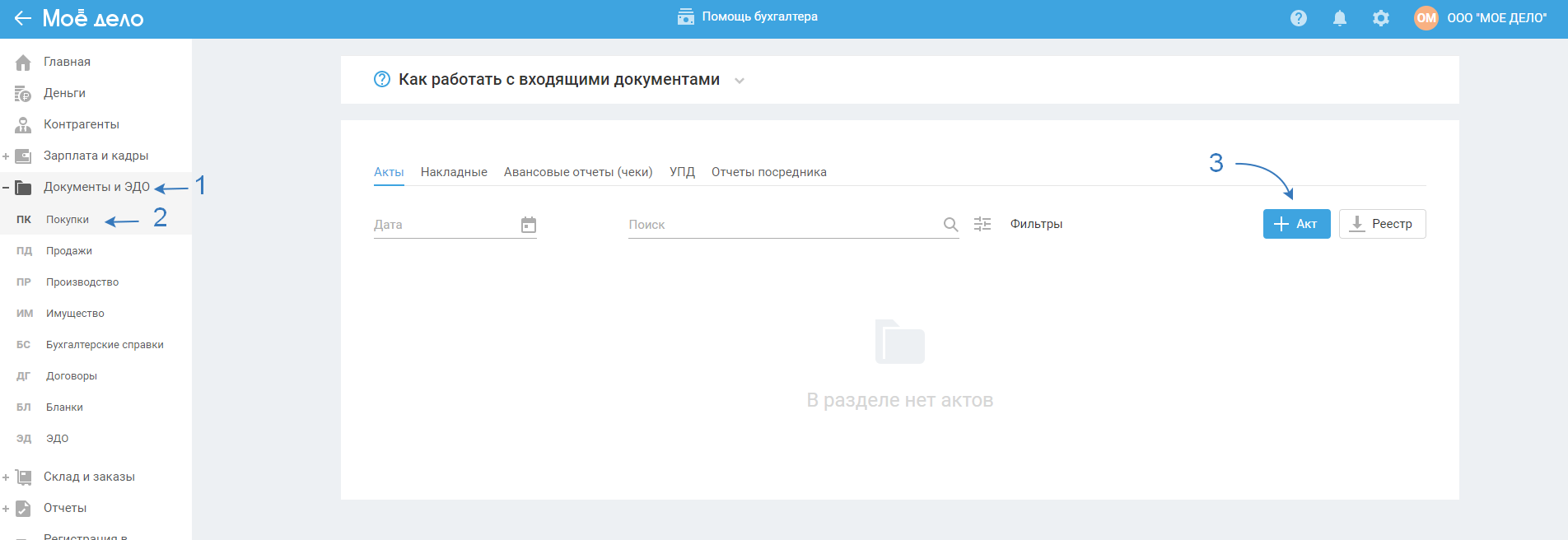 4. Нового контрагента можно добавить при добавлении первичных документов в разделе «Покупки» в случае, если при создании документа необходимо указать контрагента, который ранее еще не был отражен в сервисе в разделе «Контрагенты». Рассмотрим на примере Акта.
