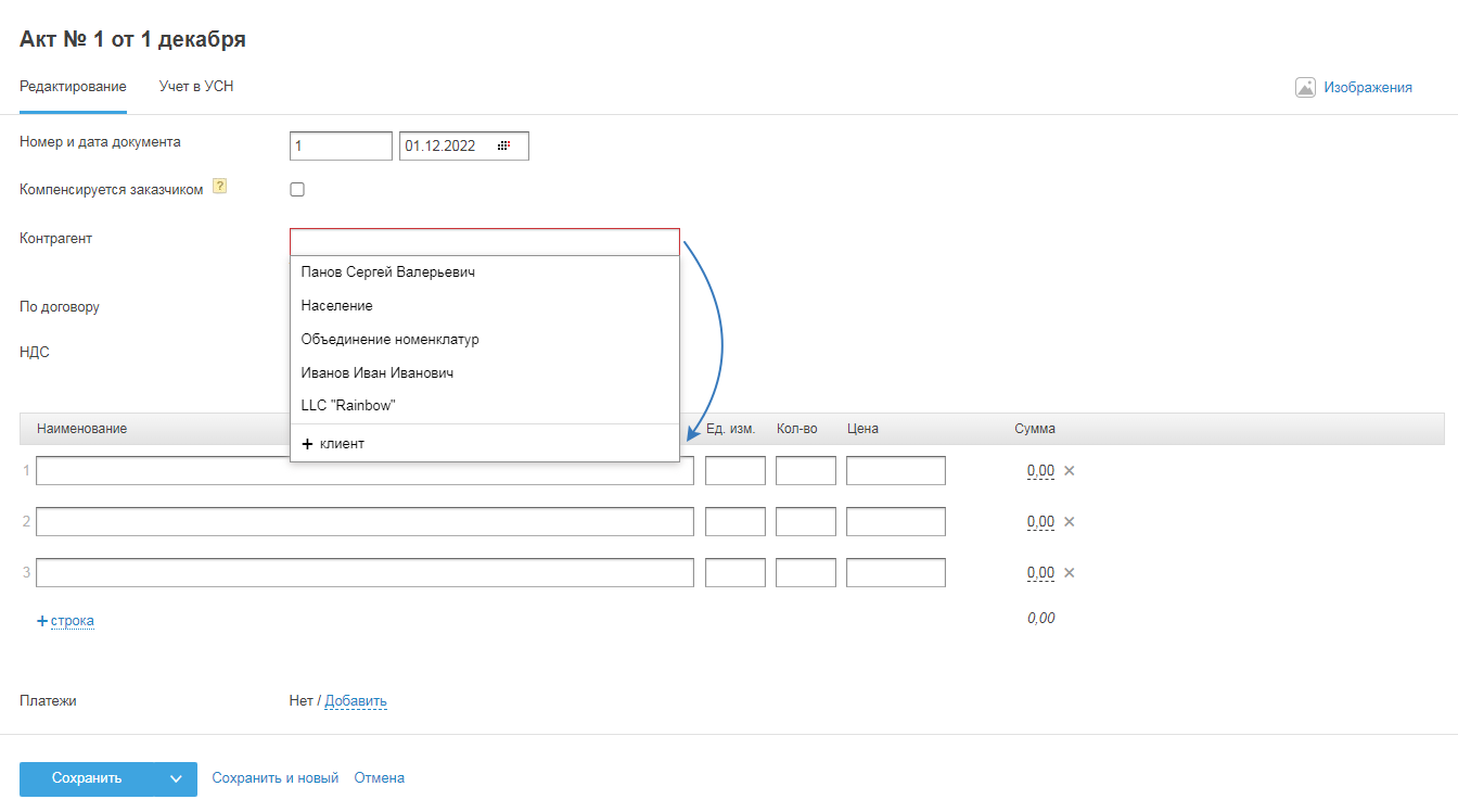 В форме создания Акта в режиме заполнения в поле "Контрагент" из выпадающего списка выберите опцию "+клиент" .