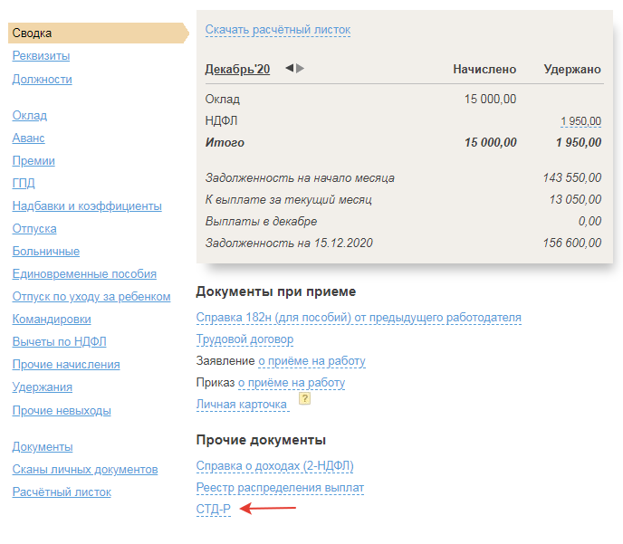Для сотрудника в штате доступно скачивание формы СТД-Р (Сведения о трудовой деятельности выдаются при увольнении или по запросу сотрудника с электронной трудовой книжкой). При нажатии на ссылку "СТД-Р" в блоке "Прочие документы", скачивается заполненный бланк в формате word с данными о трудовой деятельности по сотруднику: