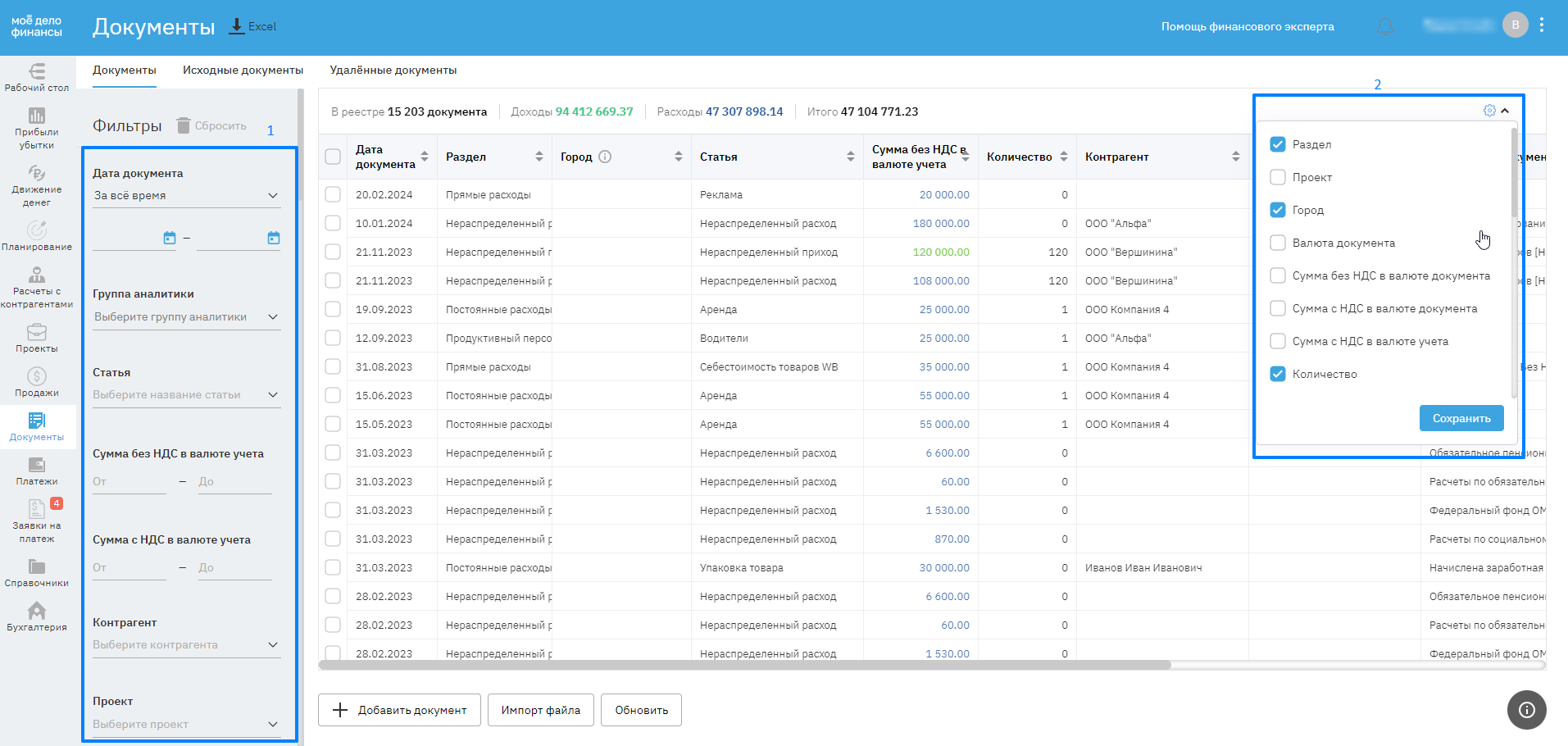 Для поиска необходимого документа в реестре используйте «Фильтры» (1). При нажатии на кнопку «Столбцы», вы можете выбрать необходимые значения для реестра (2).