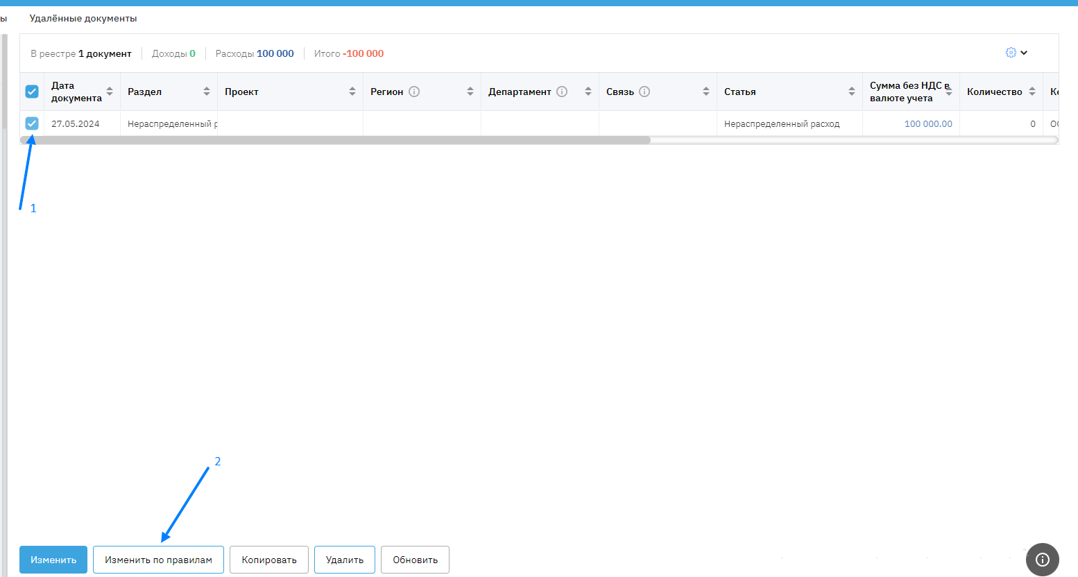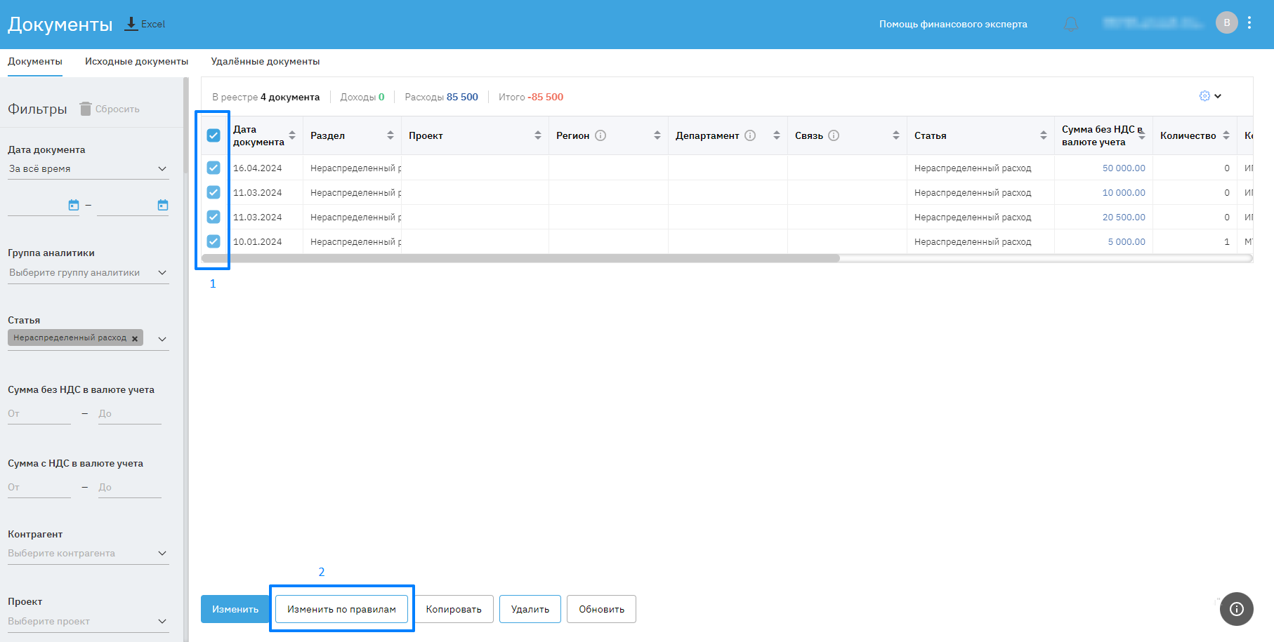 Чтобы изменить правило, выделите любой документ галкой, далее нажмите «Изменить по правилам»: