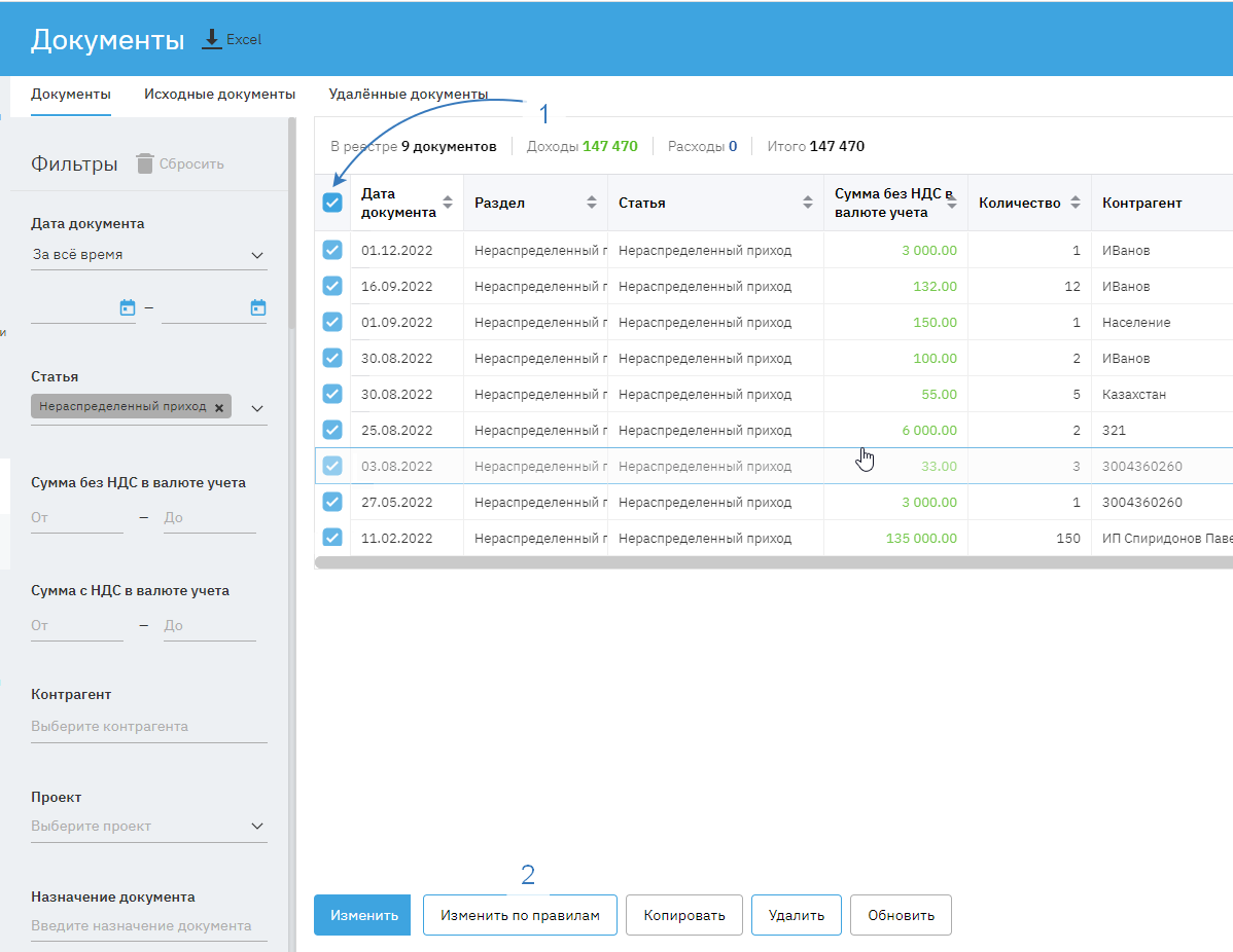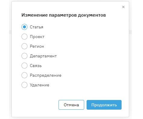 Выделите в чек-боксе сразу несколько документов, нажмите кнопку «Изменить по правилам» и выберите параметр, который необходимо проставить (например, Проект).