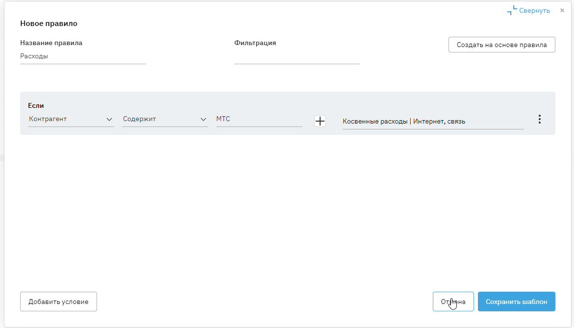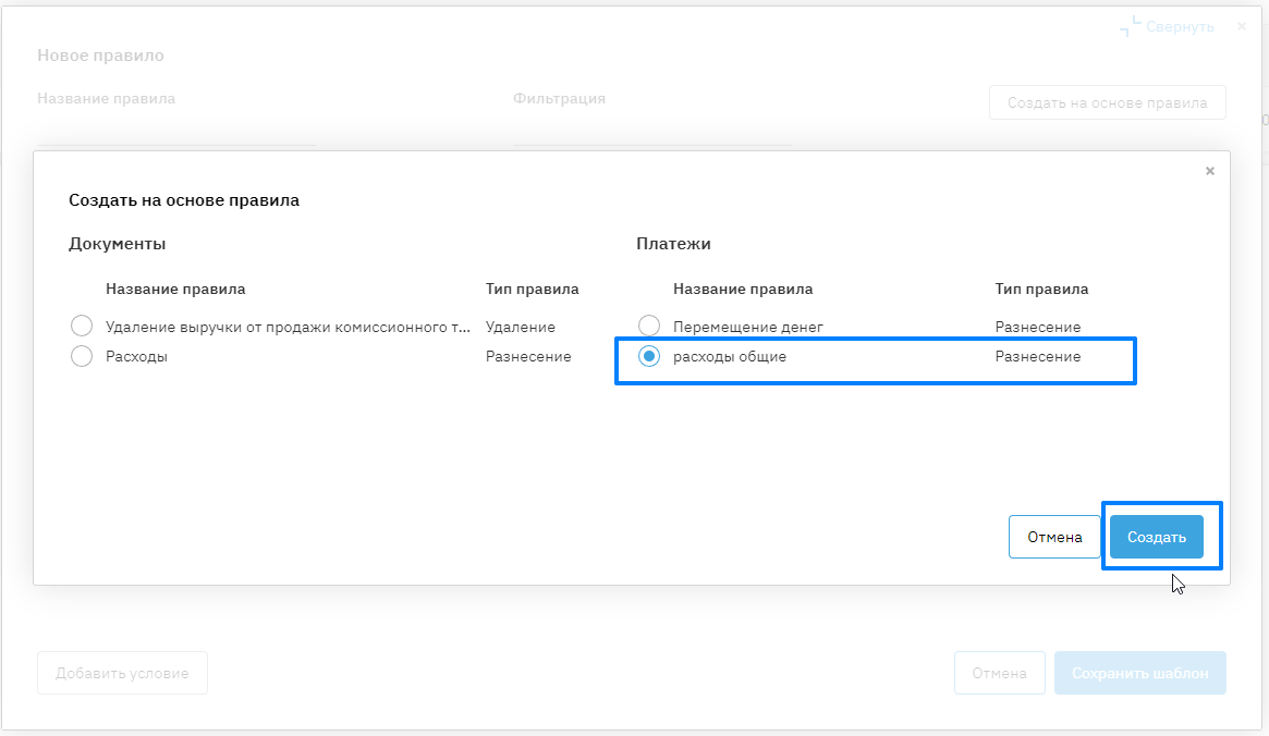 Опция «Создать на основе правила» поможет вам создать новое правило на основе выбранных документов или платежей: