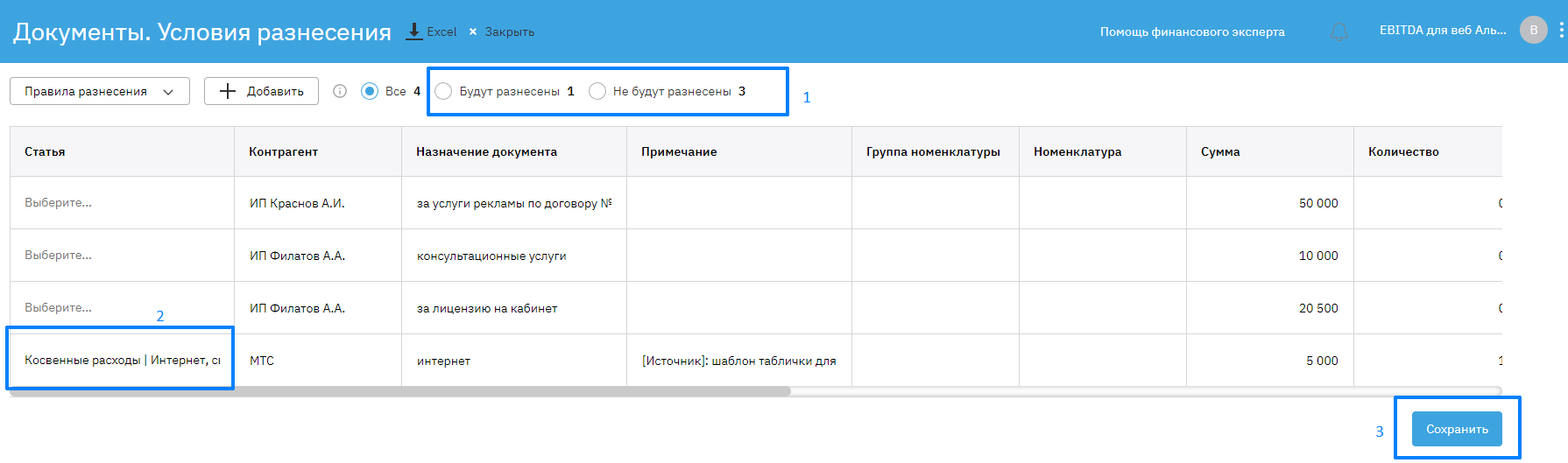 Сервис покажет, сколько документов будет разнесено по правилам, а к каким документам правила не применились (1).