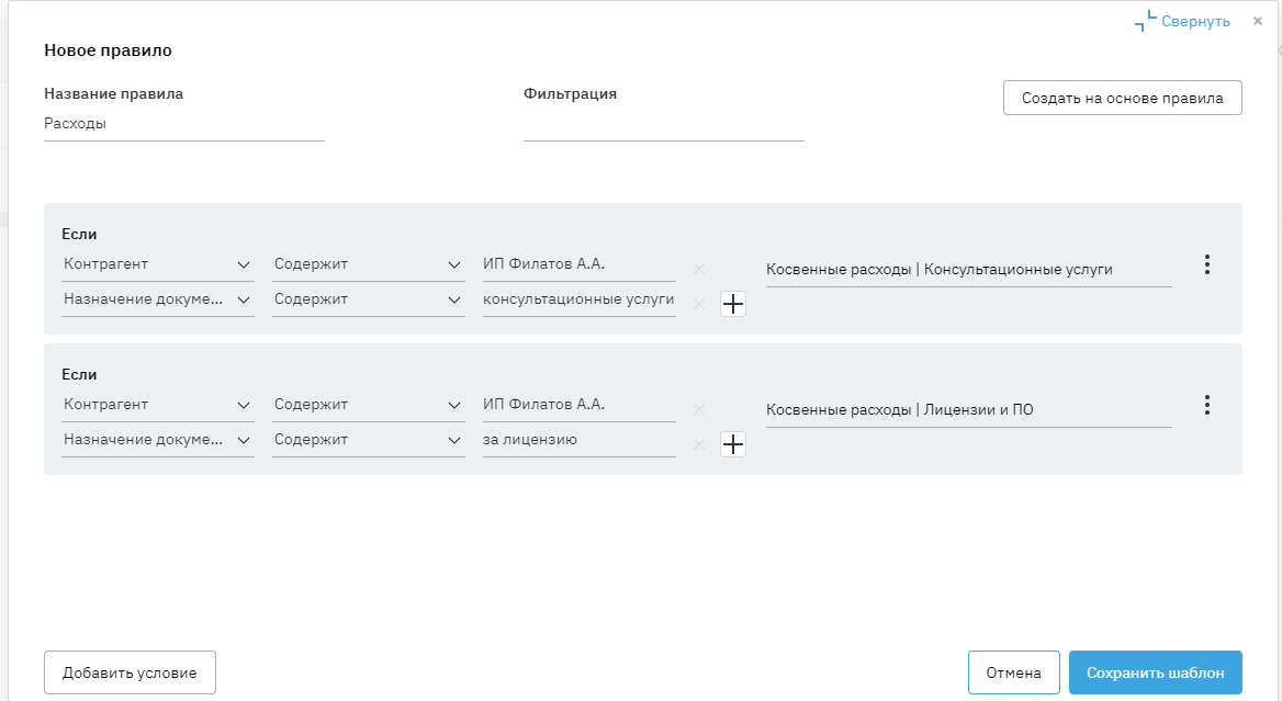 Бывают ситуации, когда необходимо задать несколько условий в одном правиле. Например, один и тот же Контрагент оказывает консультационные услуги и продаёт программное обеспечение. В данном случае для того чтобы распределить расходы по разным статьям, некорректно будет указать в условии только Контрагента. Добавляем второе условие по назначению документа.