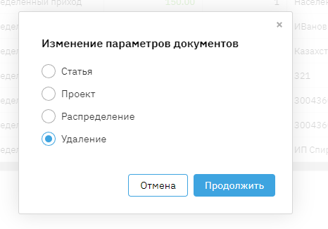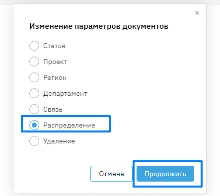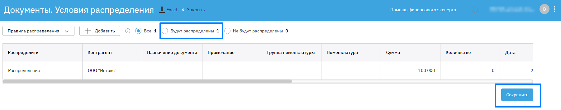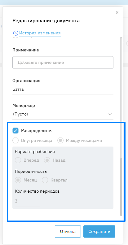 Также здесь можно задать параметр, по которому будет распределение (проект, статья, примечание, контрагент):