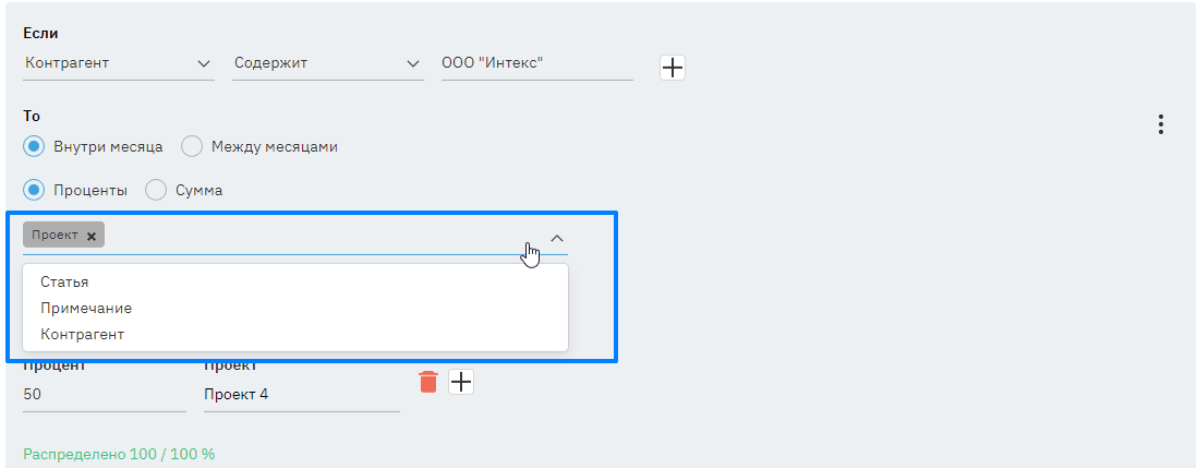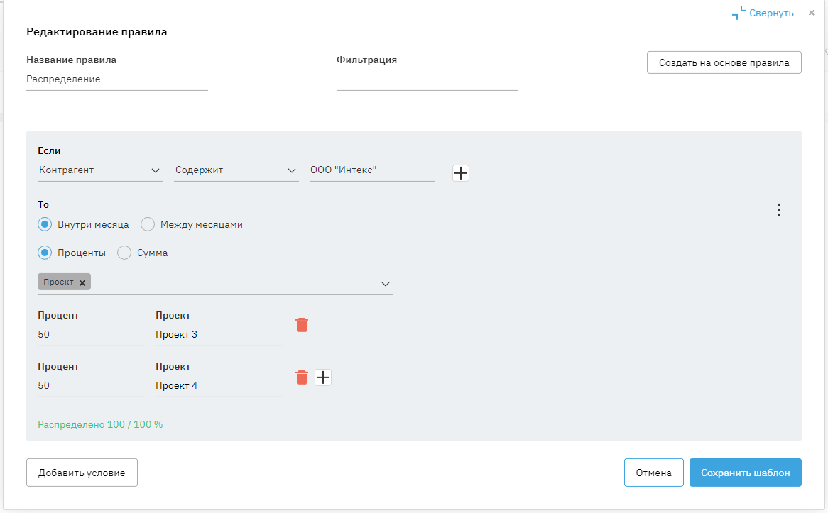 Например, необходимо распределять документы внутри месяца по определённому контрагенту между 2-мя проектами по процентам. Данное правило будет выглядеть так: