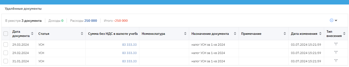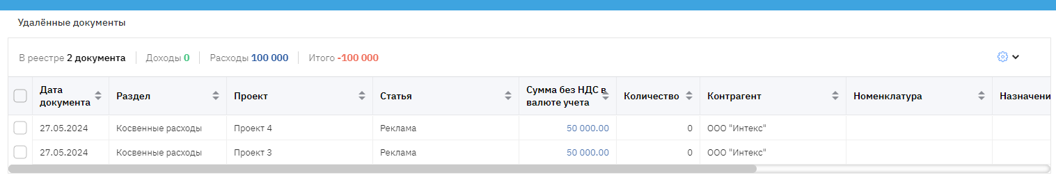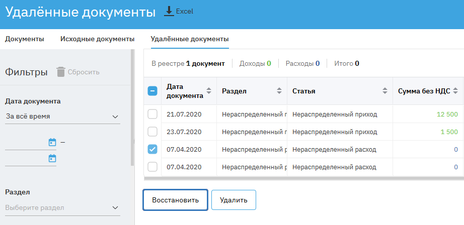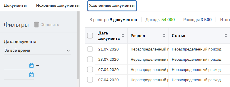 В разделе «Документы» все документы, которые были удалены, вы сможете увидеть во вкладке «Удаленные документы»: