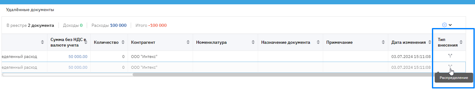 У распределённых документов в типе внесения отражается соответствующий значок: