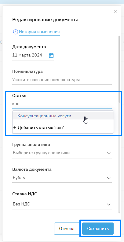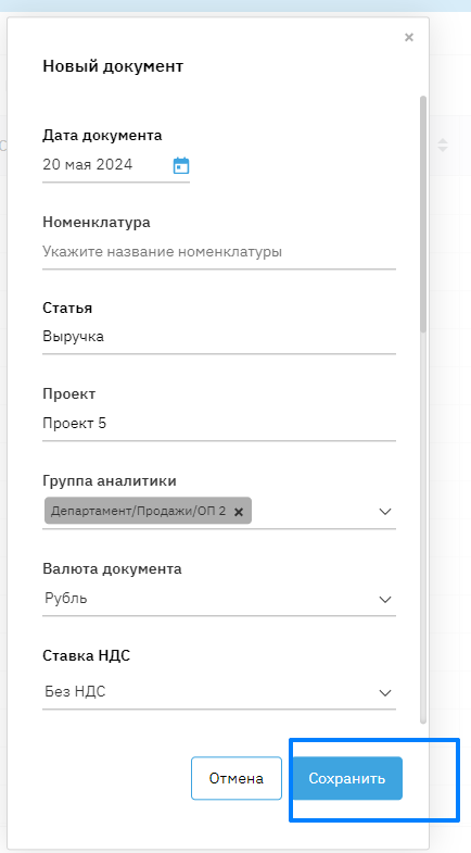 Для того чтобы распределить аналитику вручную, зайдите в документ (нажав на него двойным щелчком мышки) и в нужном поле проставьте необходимую информацию. Далее нажмите «Сохранить»: