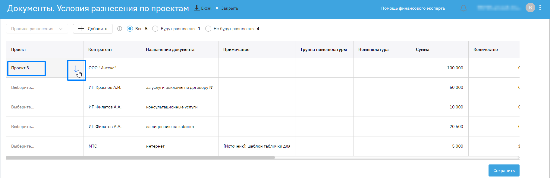 Если в документе содержится контрагент ООО «Интекс», то сумма в исходном документе будет автоматически разбита по правилу на 2 равные части. Одна часть будет относится к Проекту 3, а другая к Проекту 4.