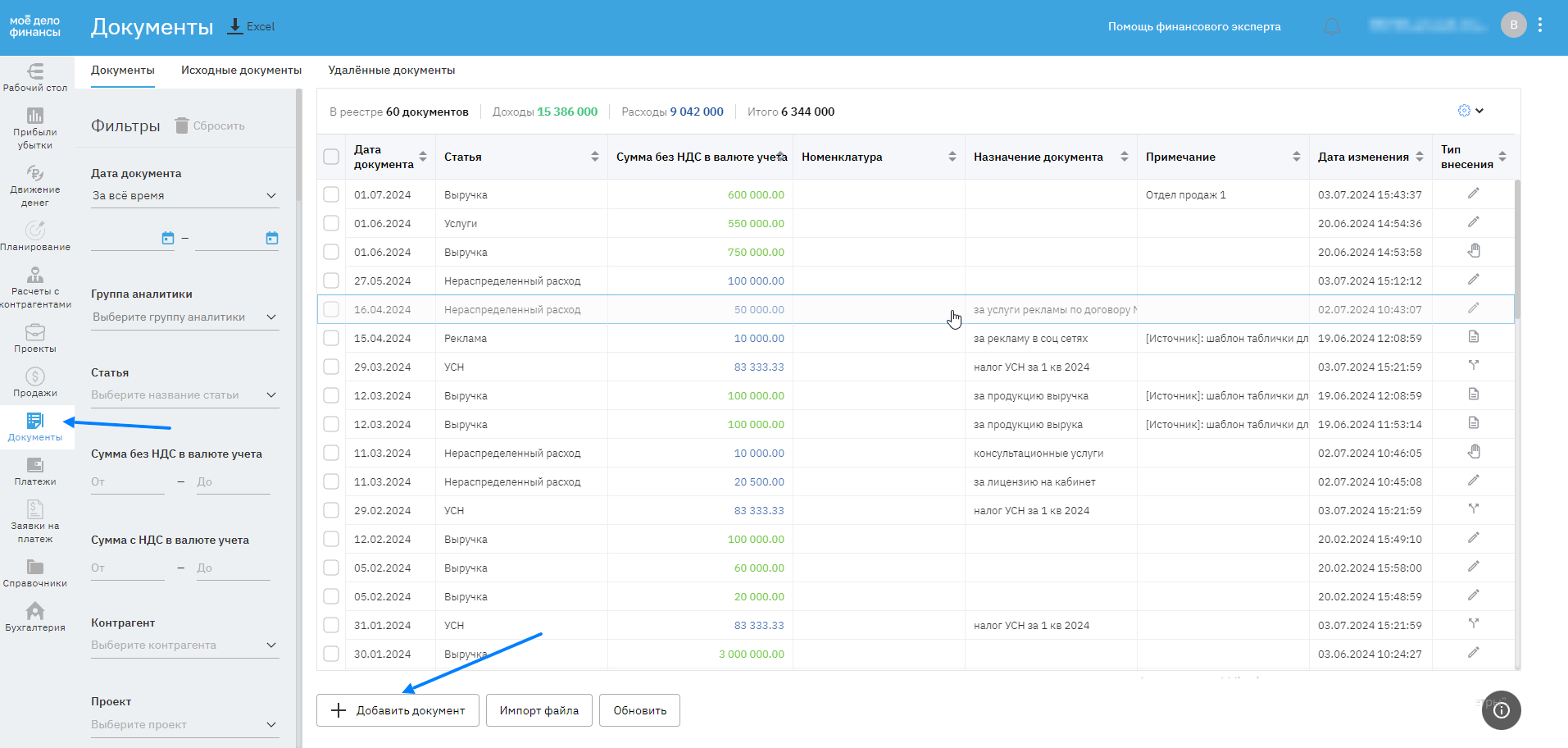 Зайдите в реестр Документы и нажмите кнопку «Добавить документ»: