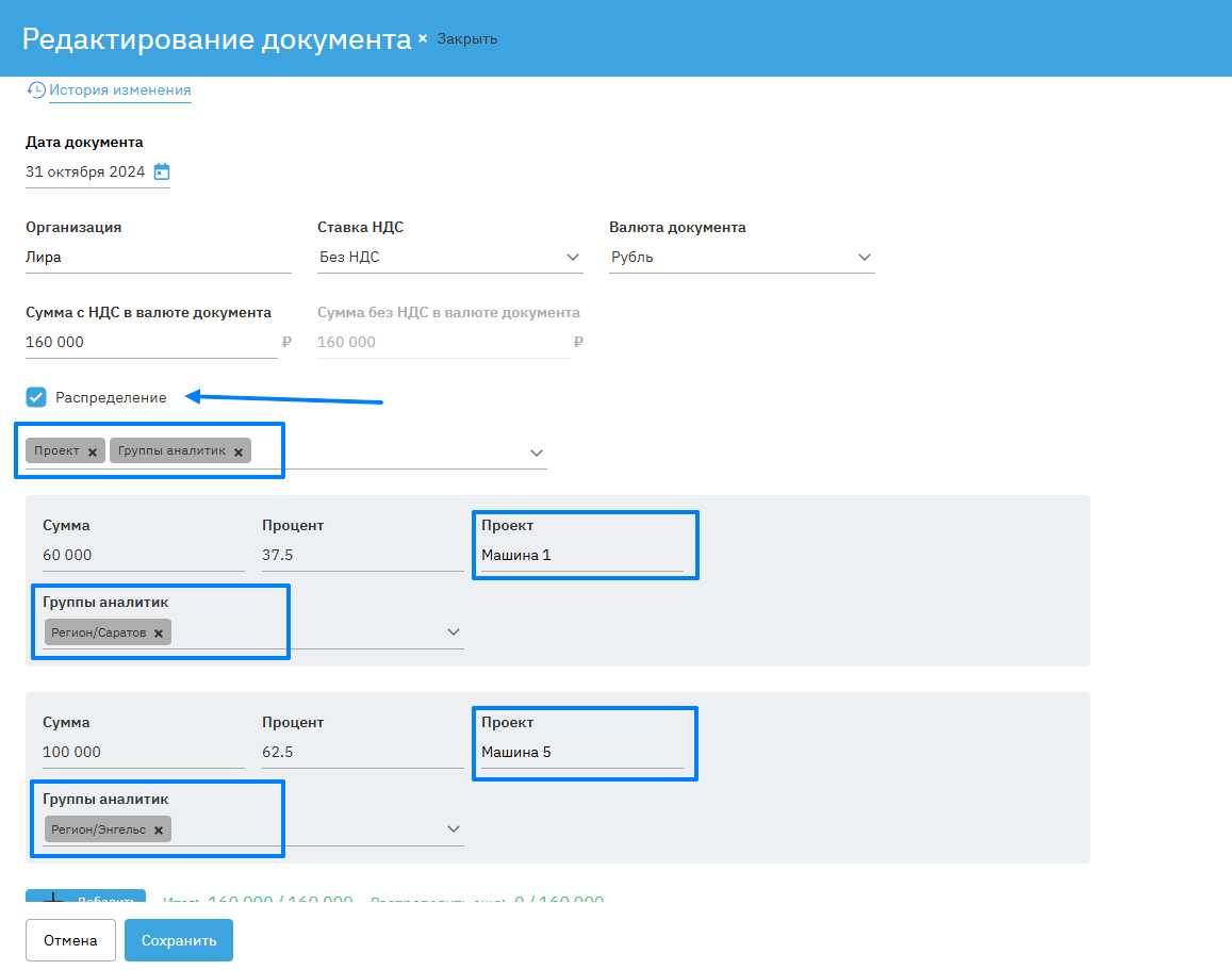 Например, 1 документ нужно разделить на 2 части и отнести их на разные «Проекты» и разные «Группы аналитик» (см. скрин):