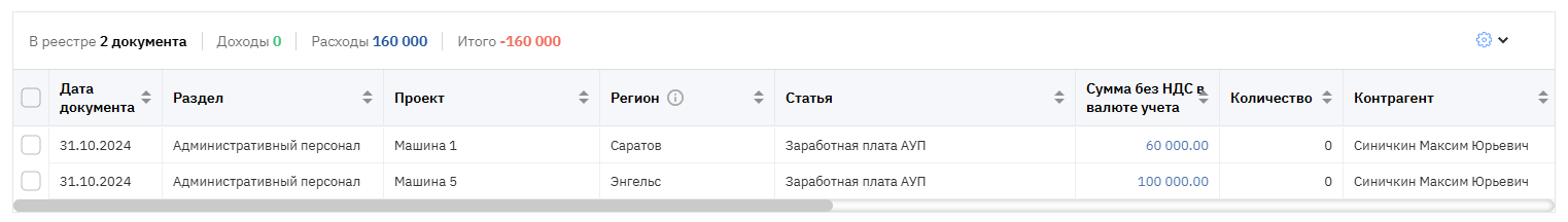 Данный реестр позволяет посмотреть документы, на основании которых строится управленческая отчётность (отчёт о прибылях и убытках).