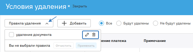 В левом верхнем углу будет доступен выпадающий список с ранее созданными правилами, и слева от названия правила будут доступны кнопки редактирование и удаления: