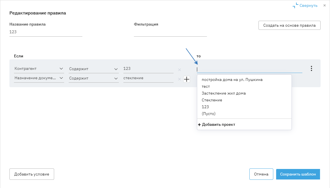 Если выбранные вами документы уже разнесены по проектам, и вы хотите снять с них проект, то в редактировании правила выберите «Пусто»: