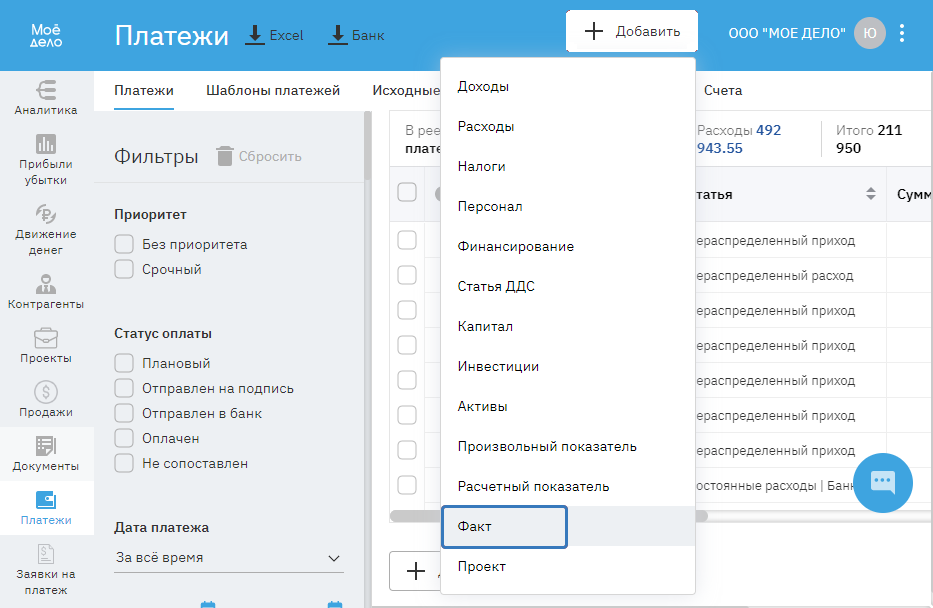 Для того чтобы создать документ на основе платежей при импорте, нажмите кнопку «Добавить» и выбираем «Факт»: