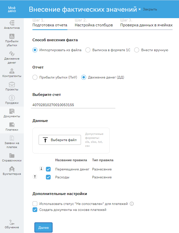 Нужно выбрать «Способ внесения факта», отчёт, в котором будут отражаться эти данные и расчётный счёт. Для загрузки данных нажмите кнопку «Выберите файл». Отметьте опцию «Создать документы на основе платежей». Затем нажмите кнопку «Далее»:
