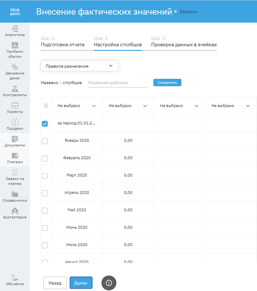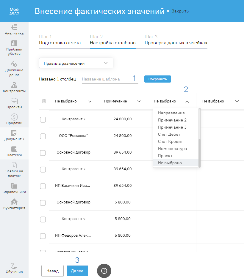 После загрузки документа необходимо настроить столбцы: ввести название шаблона и нажать кнопку «Сохранить» или выбрать из выпадающего списка уже существующие. Обязательна к добавлению колонка «Дата», для перехода на следующий шаг нужно выбрать колонку: «Приход», «Расход» или «Сумма».