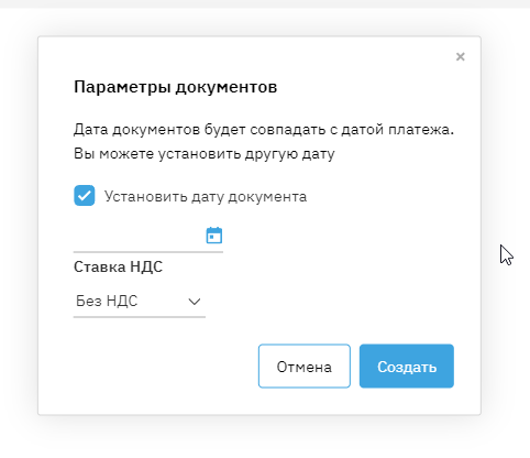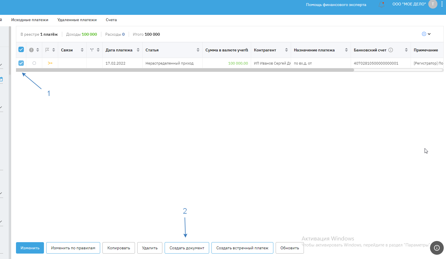 Если необходимо создать документ к определённому платежу, выделите галкой платёж, нажмите кнопку «Создать документ»: