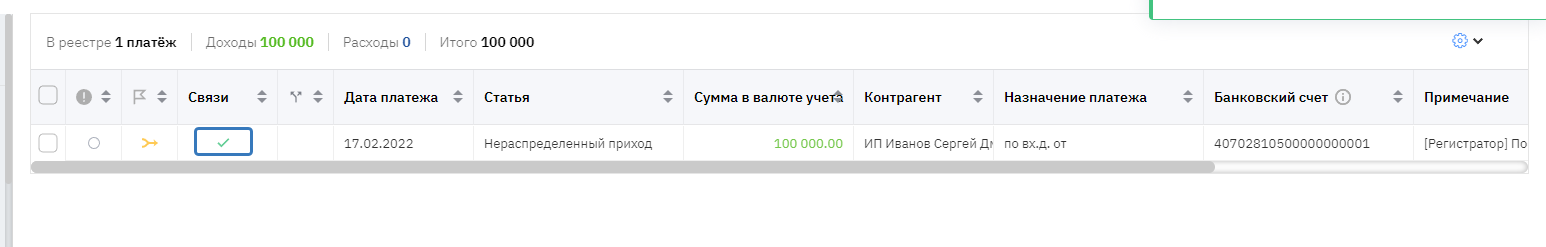 Если вы включили настройку «Создать документ на основе платежа», то вы можете переходить из документа в привязанный платёж.