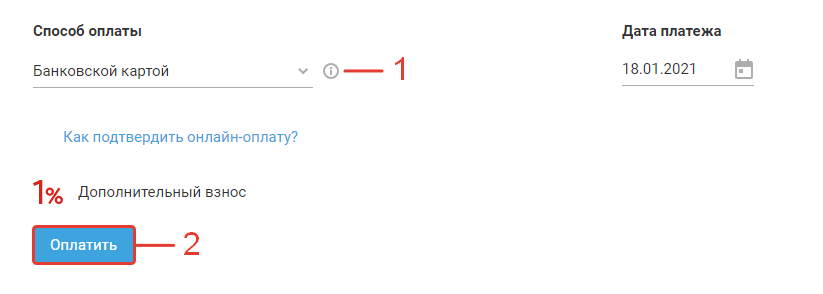 Взносы можно оплатить банковской картой, для этого в поле «Способ оплаты» выберите из выпадающего списка — «Банковской картой».