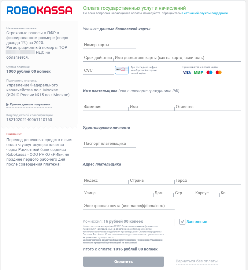 После нажатия на кнопку «Оплатить», вы будете перенаправлены на сайт платежного сервиса opg.robokassa.ru. В открывшемся окне введите реквизиты банковской карты и укажите сведения о плательщике, после чего нажмите «Оплатить».