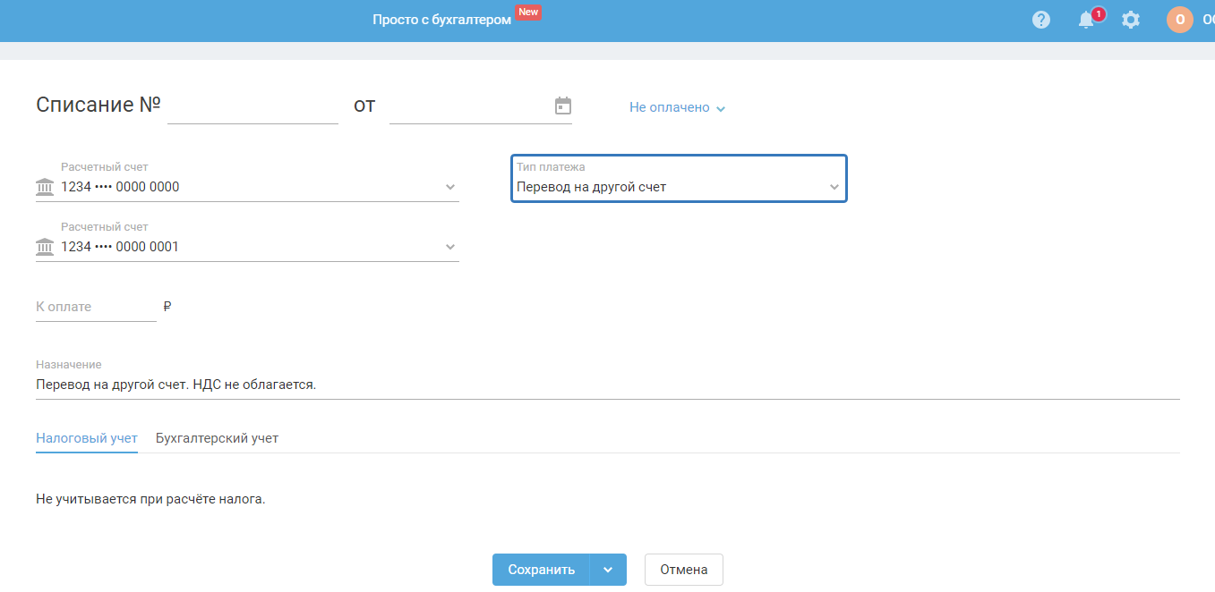 В блоке «Налоговый учёт» будет пусто, так как перевод средств между своими счетами не облагается налогом.