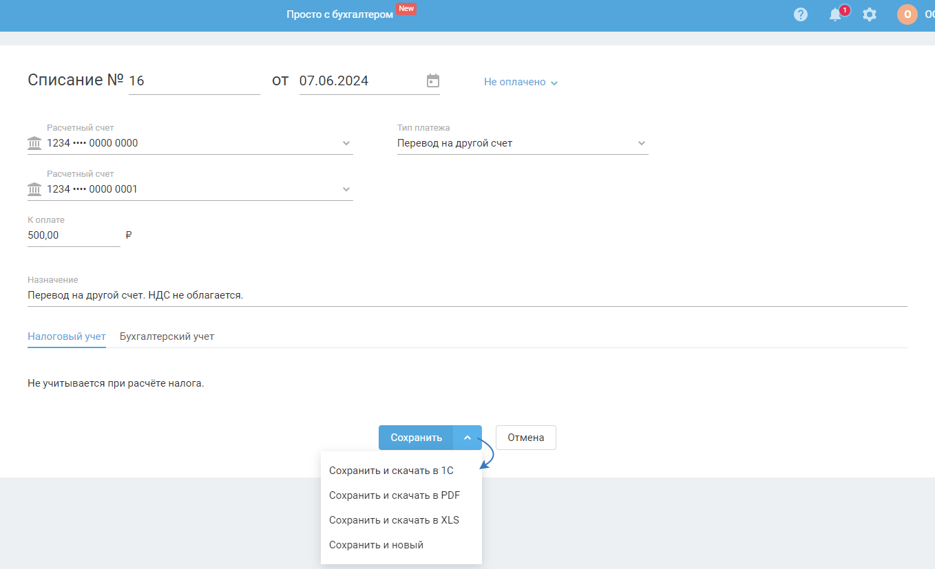 Если перевода ещё не было, и необходимо сформировать платёжное поручение для банка, то выберите статус «Не оплачено» и после ввода данных нажмите «Сохранить и скачать 1С». Функция позволяет скачать платёжное поручение в электронном формате, чтобы загрузить в банк, а не формировать вручную. После загрузки файла сохраните его на компьютере, после загрузите в свой клиент-банк.